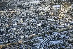Old City from the Mount of Olives with Al-Aqsa and Dome of the Rock on the Temple Mount Tower of David Zion Square Chords Bridge Mamilla Mall Western Wall Shrine of the Book Holy Sepulchre | |
