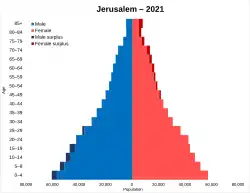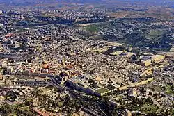 Throughout its long history, Jerusalem has been destroyed at least twice, besieged 23 times, captured and recaptured 44 times, and attacked 52 times.[8] The part of Jerusalem called the City of David shows first signs of settlement in the 4th millennium BCE, in the shape of encampments of nomadic shepherds.[9] During the Canaanite period (14th century BCE), Jerusalem was named as Urusalim on ancient Egyptian tablets, probably meaning "City of Shalem" after a Canaanite deity. During the Israelite period, significant construction activity in Jerusalem began in the 10th century BCE (Iron Age II), and by the 9th century BCE, the city had developed into the religious and administrative center of the Kingdom of Judah.[10] In 1538, the city walls were rebuilt for a last time around Jerusalem under Suleiman the Magnificent of the Ottoman Empire. Today those walls define the Old City, which since the 19th century has been divided into four quarters—the Armenian, Christian, Jewish, and Muslim quarters.[11][12] The Old City became a World Heritage Site in 1981, and is on the List of World Heritage in Danger.[13] Since 1860, Jerusalem has grown far beyond the Old City's boundaries. In 2022, Jerusalem had a population of some 971,800 residents, of which almost 60% were Jews and almost 40% Palestinians.[14][note 4] In 2020, the population was 951,100, of which Jews comprised 570,100 (59.9%), Muslims 353,800 (37.2%), Christians 16,300 (1.7%), and 10,800 unclassified (1.1%).[16]