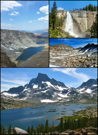 After some elevation gain via long switchbacks, the trail reaches the top of Nevada Falls.[23] The trail continues into Little Yosemite Valley, past the trail junctions to Half Dome and Cloud's Rest, and then into a subalpine basin and passing the Sunrise High Sierra Camp. The trail then crosses the Cathedral Range at Cathedral Pass before dropping steeply into Tuolumne Meadows, a common resupply point. The trail passes a visitor's center and some campgrounds before linking up with the Pacific Crest Trail. The John Muir Trail/Pacific Crest Trail then turns south, through the mild Lyell Canyon meadow, and crosses the Cathedral Range again and exits the park at Donahue Pass.[3]