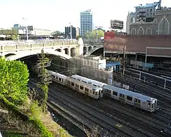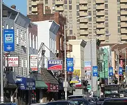 The bridge carrying the boulevard was designed by consulting engineer Abraham Burton Cohen and completed in 1926.[6] For most of the twentieth century Journal Square was the cultural entertainment center of Hudson County,[7] home to the movie palaces built in the 1920s: The State (1922, and since demolished),[8] the Stanley Theater (1928),[9] and the Loew's Jersey Theater (1929).[10] Karen Angel of The New York Daily News described Journal Square from the 1920s to the 1960s as a "crown jewel, a glowing commercial, entertainment and transportation hub of the city."[11] The "Jersey Bounce", a hit song in the 1940s mentions Journal Square in its lyrics as the place where it got started. Two days before Election Day in 1960 John F. Kennedy made his last campaign speech at Journal Square, before returning to New England.[12] Hudson Boulevard was named Kennedy Boulevard soon after his assassination. The Tube Bar, so-called for the Hudson Tubes (as the fore-runner of the PATH system was called) was made famous by Louis "Red" Deutsch getting prank calls there.[13]
