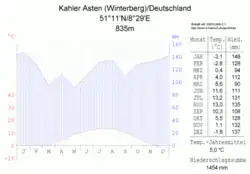 The climate of the Kahler Asten is characterized by high precipitation spread mostly evenly across the year, with a slight peak in winter, resulting in an often massive snowpack. In the Köppen-Geiger climate classification system it is classified as Cfb (warm-summer oceanic), but bordering Dfb (warm-summer humid continental/hemiboreal) and also Cfc (subpolar oceanic), as only four months have a mean temperature above 10°C; when using the 0°C rather than the -3°C threshold, it is even Dfb proper, like many locations in the higher reaches of Germany's uplands.