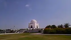 Clockwise from top-left: Old Karachi Municipal Corporation, I. I. Chundrigar Road, Frere Hall, View of Mazar-e-Quaid, National Museum of Pakistan