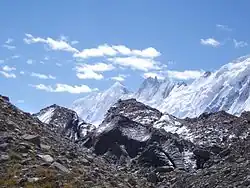 The Karakoram is in one of the world's most geologically active areas, at the plate boundary between the Indo-Australian plate and the Eurasian plate.[15] A significant part, somewhere between 28 and 50 percent, of the Karakoram Range is glaciated covering an area of more than 15,000 square kilometres or 5,800 square miles,[16] compared to between 8 and 12 percent of the Himalaya and 2.2 percent of the Alps.[17] Mountain glaciers may serve as an indicator of climate change, advancing and receding with long-term changes in temperature and precipitation. The Karakoram glaciers are slightly retreating,[18][19][20] unlike the Himalayas where glaciers are losing mass at significantly higher rate, many Karakoram glaciers are covered in a layer of rubble which insulates the ice from the warmth of the sun.[21] Where there is no such insulation, the rate of retreat is high.[22]