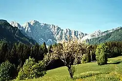 The Karawanks[1][2] or Karavankas[3][4] or Karavanks[5][6] (Slovene: Karavanke; German: Karawanken, German pronunciation: [kaʁaˈvaŋkŋ̍] ⓘ) are a mountain range of the Southern Limestone Alps on the border between Slovenia to the south and Austria to the north. With a total length of 120 kilometres (75 mi) in an east–west direction, the Karawanks chain is one of the longest ranges in Europe.[7] It is traversed by important trade routes and has a great tourist significance. Geographically and geologically, it is divided into the higher Western Karawanks and the lower-lying Eastern Karawanks. It is traversed by the Periadriatic Seam, separating the Apulian tectonic plate from the Eurasian Plate.