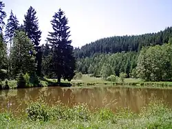The Katzsohlteich is an artificially impounded reservoir that lies southwest of the town of Güntersberge in the Harz Mountains of central Germany and is used as a preflooder (Vorfluter) and fishpond. Only a few metres from the pond is the considerably larger lake of Bergsee, past the southern shores of which runs the Selke Valley Railway.