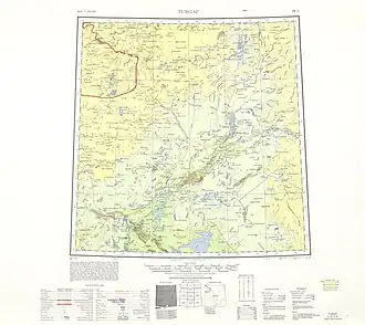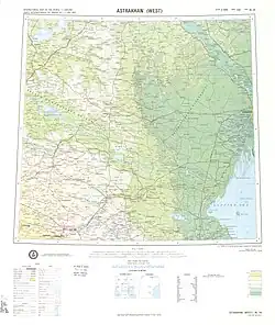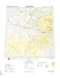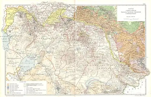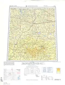 NTD of the area along ethnic lines had been proposed as early as 1920.[9][10] During Tsarist times the general area of modern Kazakhstan was composed of four regions (oblasts); west-to-east these were Ural (plus part of Transcaspian Oblast, Turgai, Akmolinsk and Semipalatinsk. All four oblasts had been created by a Decree of Tsar Alexander II of 21 October (2 November) 1868.[11] On 26 August 1920 the Kirghiz Autonomous Socialist Soviet Republic (KASSR, located within the Russian Soviet Federative Socialist Republic, RSFSR) was created from these four provinces (briefly joined together in this period in the short-lived Alash Autonomy), with the northern border of the ASSR essentially following that of the former four oblasts, though adjusted in places to reflect local demographics; however, disputes over specific areas of the boundary continued into the following year.[12] At this time Kazakhs were referred to as "Kyrgyz" and what are now the Kyrgyz were deemed a sub-group of the Kazakhs and referred to as "Kara-Kyrgyz" (i.e. mountain-dwelling black-Kyrgyz).[13][14] The areas west of the Ural river associated with the Kazakh Bukey Horde were claimed by both the KASSR and Astrakhan Oblast, with most of the area going to the KASSR in 1921, including Kurmangazy and Sinemorsk.[15] Elsewhere, some Russian-inhabited areas of the four oblasts, such as Omsk, were transferred to Russia.[16][17][15]
