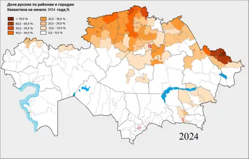 The boundary became an international frontier in 1991 following the dissolution of the Soviet Union and the independence of its constituent republics. Thousands of ethnic Russians who had migrated to Kazakhstan in Soviet times left, fearing marginalisation in the new Kazakh-dominated state.[18][19] In 1989 the Russian population stood at about 6,227,549 (37.82% of the population), though by 1999 this figure had fallen to 4,479,618 (29.95%)[20] and in 2009 it stood at 3,793,764 (23.69%).[21][22][23][24][25] As of 2019 Russians are estimated to make up 19.3% of the population and are heavily concentrated in the country's north along the Russian border.[26][2]