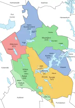 The municipal center eventually moved from the village of Keikyä to the village of Pehula (also called Äetsä) as it was closer to the factories and a train station.[5] Keikyä united with neighboring Kiikka in 1981 to form Äetsä, with its center in Pehula. In 2009, Äetsä united with Vammala and Mouhijärvi to form the town of Sastamala.