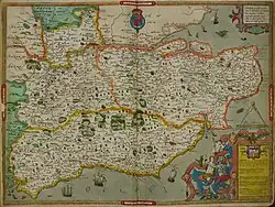 Hand-drawn map of Kent, Sussex, Surrey and Middlesex from 1575.