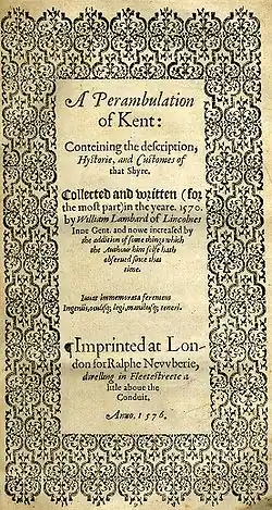 Title page of William Lambarde's Perambulation of Kent (completed in 1570 and published in 1576), a historical description of Kent and the first published county history