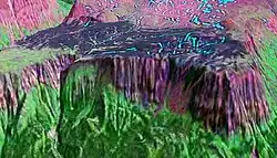 ![]() False colour image of air-fall tephra on the Kitsu Plateau from The Ash Pit which is the circular depression at bottom left centre | |