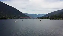 Kootenay Lake is a long, narrow and deep fjord-like lake located between the Selkirk and Purcell mountain ranges in the Kootenay region of British Columbia.[3][4] It is one of the largest lakes in British Columbia, at 104 km in length and 3–5 km in width.[1] It is, in part, a widening of the Kootenay River, which in turn drains into the Columbia River system at Castlegar, British Columbia.[1]