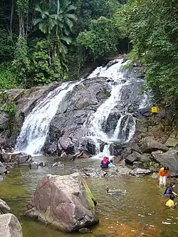 The waterfalls are 36 meters high, and are located at the base of the 634 meter high Gunung Muntahak mountain. The river water drains through a series of shallow pools used for swimming. The natural environment of some parts of the location has somewhat been spoiled by resort development with artificial landscaping.
