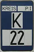 Unlike local roads (Gemeindestraßen) the Kreisstraßen are invariably numbered, but their numbering is not shown on signs. The abbreviation is a prefixed capital letter K followed by a serial number. In most states the car number plate prefix for the district is placed in front of the road number instead, for example in Bavaria. The Kreisstraßen are numbered in the individual federal states as follows: