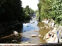 On 28 June 1888 Berlin's city parliament decided for City Garden Director Hermann Mächtig's design for a park on the acquired unbuilt slopes of Kreuzberg, including a waterfall between the monument on top of the Kreuzberg and the Großbeerenstraße.[49] The park was named Victoria Park (Viktoriapark), in honour of Princess Victoria of Great Britain and Ireland, Prussian and German crown princess consort.[52] Mächtig and the sculptor Albert Manthe travelled through the Giant Mountains visiting natural waterfalls to get inspired.[53] Having returned Mächtig himself assisted by a confidant foreman started modelling and constructions for the park.[49] For the waterfall Mächtig used pieces of rock from the Giant Mountains and boulders.[54] The Wolfsschlucht (lit. wolf's gully) was designed into another exploited sand pit east of the hill top.[55] Some built-up parcels on the southern side of Kreuzbergstraße had been bought and the houses there were demolished in order to include their plots into the park. In 1894 the Victoria Park opened.