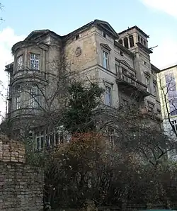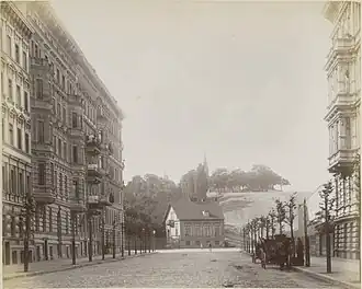 In 1871 22 families founded the Villen-Sozietät Wilhelmshöhe, an association to develop a neighbourhood of villas on the eastern slope of the Kreuzberg.[44] At the eastern slope, partially quite steep due to an exploited sand pit there, a little dead end was laid out named Wilhelmshöhe after Wilhelmshöhe Palace.[45] Forty villas were planned, but only twenty were realised, since the area dropped in the favour of the better-off, when the urbanisation caused the adjacent quarters to be built up with blocks of flats. Four villas weathered the times, however, two of them overformed by later extensions alienating their original design. Lindenberg House, on Methfesselstraße 23–25 by Ewald Becher in 1874, is one of the villas in original design, however, dilapidated.[46] It is - among others - the domicile of the house of literature, venue and organiser of readings named Lettrétage since 2006.