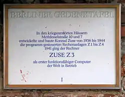 The DVL granted research subsidies so that in 1941 Zuse rented a workshop on the opposite side in Methfesselstraße 7 and stretching through the block to Belle-Alliance Straße 29 (renamed and renumbered as Mehringdamm 84 in 1947).[60] On 12 May 1941 Zuse presented the world's first functioning computer, Z3 built in his workshop, to the public.[61][62] While Z3 was destroyed with the workshop in an Allied Air raid in 1943 and the parental flat in the following year, the successor Z4 was constructed in a new premise in Oranienstraße 6 and evacuated from Berlin on 14 February 1945, only arriving in Göttingen two weeks later.[63]
