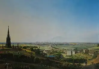 In 1837 the bankrupted Tivoli on the Kreuzberg was put up for public auction.[26] The purchasers sold it on to Mr. Siegmund, who reopened the Tivoli with a two-storey ballroom in 1841, only to bankrupt again the year after.[26] The Kreuzberg and the neighbouring hills, then still part of the Tempelhof municipality, were popular sites for excursions, because of the beautiful sight onto Berlin, but also because of the beer gardens and inns which already allowed smoking, since within Berlin's city boundaries the royal police had forbidden smoking in the public.[37][38] After March Revolution of 1848 the royal government and its police had to reduce their authoritarianism and left smoking to everybody's own discretion.[38] On 6 August 1848 people gathered at the monument demonstrating for the unification of Germany, rendering homage to Archduke John of Austria as regent of the to-be-unified Empire, flagging the monument with the union tricolour of Black-Red-Gold, much opposed by the various Prussian nationalist formations.[39]