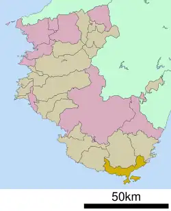 Kushimoto (串本町, Kushimoto-chō) is a coastal town located in Higashimuro District, Wakayama Prefecture, Japan. As of 30 November 2021, the town had an estimated population of 15,192 in 8354 households and a population density of 110 persons per km2.[1] The total area of the town is 135.67 square kilometres (52.38 sq mi).