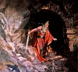 According to a king asleep in mountain legend, Emperor Frederick Barbarossa, who actually drowned on 10 June 1190 in the Calycadnus River near Seleukeia in Asia Minor during the Third Crusade, is not in fact dead, but sleeps in a hidden chamber underneath the Kyffhäuser hills. He sits motionless at a stone table and his beard has supposedly grown so long over the centuries that it grew through the table. As in the similar legend of King Arthur, Barbarossa supposedly awaits Germany's hour of greatest need, when he will emerge once again from under the hill. The presence of ravens circling the Kyffhäuser summit is said to be a sign of Barbarossa's continuing presence. Similar rapture legends refer to Emperor Frederick II or to Charlemagne sleeping in the Untersberg near Salzburg.