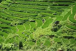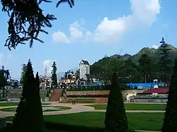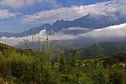 Sa Pa is one of 21 national tourism areas in Vietnam. Sa Pa is at an altitude of 1,200–1,800 metres (3,900–5,900 ft), has a mild climate throughout the year, lush, forested and mountainous scenery, waterfalls and is a hub of cultural activities of various ethnic minorities in the region, such as the Hmong and Dao people used to gather during the weekly market to "attend an ephemeral "Love Market" where young men and women chose partners to marry. It is 38 km away from the border town of Lào Cai. Visit to Sapa town is said to be more popular among visitors from Western countries in view of its attraction of ethnic tribals.[8][42][43] In fact, the French had established a Travel Bureau, as early as 1917, and the town was popular among the "French colonist" all through their rule as a hill resort. However, Sa Pa has gone through several rounds of destruction between 1947 and 1953, and again in 1979 due to war with French and Chinese. It has been partly restored and has gradually become a tourist hub since the region was opened to tourism in 1993. A good time to visit Sa Pa would be when rice fields in different green shades are being harvested in the fall season (September to November). The colours of the rice fields indicate the time for harvesting various plots. The women of the ethnic minority tribes who harvest the crops on the fields further accentuate the different green shades of the fields with their eye-catching red and indigo-coloured dresses.[44]