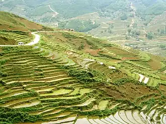 There are ten major soil groups under 30 categories in the province, under ten land groups. The land groups are: The Alluvial group (1.47% of the land area) along the Red River is good for growing food crops and trees; the Oxisol type which occupies 40% of land area has generally reddish brown soil, below altitude of 900 metres (3,000 ft), is a fertile land suitable for the annual and commercial crops; Team Red Yellow soil humus covers 30% land area in the Sa Pa, Mường Khương, Bắc Hà, Bát Xát districts of the province suitable for medicinal plants, fruit trees and vegetables; humus soil on the mountain occupies 11.42% of the land area mostly in Sa Pa district which has rich canopy of mixed forest; and the Oxisol color altered by rice in 2% of land area are formed into a landscape of terraced fields, as seen in Bắc Hà and Sa Pa districts.[14]