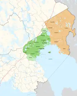 Ladoga Karelia (Finnish: Laatokan Karjala, Swedish: Ladogakarelen, Russian: Ладожская Карелия, romanized: Ladožskaja Karelija, Карельское Приладожье, Karelskoje Priladožje or Северное Приладожье, Severnoje Priladožje) is a historical region of Karelia, currently largely in Russia. Today, the term refers to the part of the Republic of Karelia in the Russian Federation comprising the south-west part of the Republic, specifically Lakhdenpokhsky District, Pitkyarantsky District and Sortavala District. This region is on the northern littoral of Lake Ladoga, which borders Olonets Karelia to the East, Leningrad Oblast (Karelian Isthmus) to the south-west and the North Karelia region of Finland to the west.[1][2]