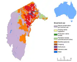 Land use is an umbrella term to describe what happens on a parcel of land. It concerns the benefits derived from using the land, and also the land management actions that humans carry out there.[1] The following categories are used for land use: forest land, cropland (agricultural land), grassland, wetlands, settlements and other lands.[2] The way humans use land, and how land use is changing, has many impacts on the environment.[3][4] Effects of land use choices and changes by humans include, for example, urban sprawl, soil erosion, soil degradation, land degradation and desertification.[5] Land use and land management practices have a major impact on natural resources including water, soil, nutrients, plants and animals.[6][7]