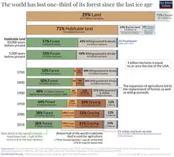 Deforestation is the systematic and permanent conversion of previously forested land for other uses.[11] It has historically been a primary facilitator of land use and land cover change.[10] Forests are a vital part of the global ecosystem and are essential to carbon capture, ecological processes, and biodiversity.[10] However, since the invention of agriculture, global forest cover has diminished by 35%.[10]