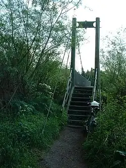 At the southern tip of the village, the Dorrator Iron Bridge used to span a meander in the River Carron until it was dismantled and replaced with a new bridge adjacent to the surviving pillar on the west side of the river, connecting Larbert with the neighbouring settlement of Camelon. The bridge was constructed in 1893 on the site of a ford, which could rarely be used when the river was in full flow.[57] The bridge is reached via a footpath leading from the bottom of Carronvale Road in Larbert.