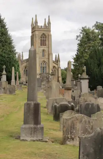 Larbert Old Parish Church stands on the western approaches to Larbert, above the River Carron. The church, designed by the Scottish architect David Hamilton, was built in 1820 at a cost of £3,000 using sandstone from a local quarry.[54] The church was built at a time of population growth and increasing prosperity in Larbert and its parish, which necessitated the construction of a more modern place of worship.[54] As Larbert grew during the 19th century, the church again became too small. Major alterations to the building were carried out in the 1880s.[55] An early chapel under the domain of the Abbot of Cambuskenneth is believed to have stood in the vicinity of the present-day church. The church is now under threat of closure as of June 2016[56]