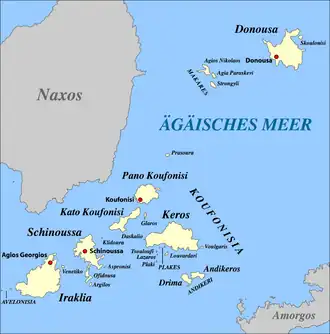 The Lesser Cyclades or Small Cyclades (Greek: Μικρές Κυκλάδες) is an island complex in the Aegean Sea, inside the archipelago of the Cyclades. It is located to the south-east of Naxos and comprises 32 islands and rocks.[1] The main islands are Ano Koufonisi, Kato Koufonisi, Irakleia, Schoinoussa, Donousa and Keros. The largest of them is Irakleia with an area of 18 km2 and the most populated is Ano Koufonisi with a population of 399, according to the 2011 census. Only four of them are inhabited, Ano Koufonisi, Irakleia, Donousa and Schoinoussa. The islet of Kato Antikeri has also two inhabitants. Administratively, the islands belong to the Naxos and Lesser Cyclades municipality apart from the islets of Ano and Kato Antikeri that belong to Amorgos municipality.