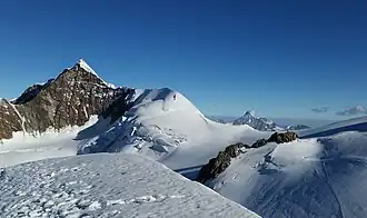 The northern side of the mountain is an impressive 1,100 metres (3,600 ft) ice-covered wall, rising up from the Grenzgletscher. The gentler southern side rises only a few hundred metres above the glacier of the same name: Lysgletscher.