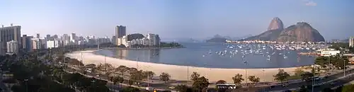 A panoramic view of Praia de Botafogo (Botafogo Beach) with Pão de Açúcar and Morro da Urca in the background.