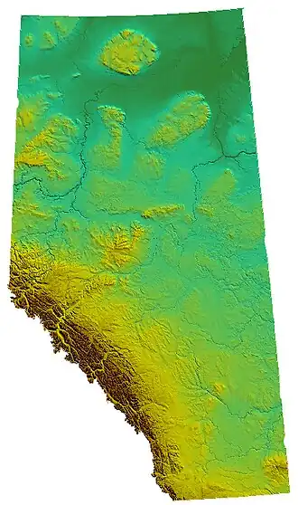 Most of Alberta's mountains are found on the western edge of the province of Alberta, consisting of the eastern slopes of the Canadian Rockies, which run through the province from Alberta's mid-point to its southern border with the United States. Other elevated spots can be found in the Caribou Mountains and the Cypress Hills.