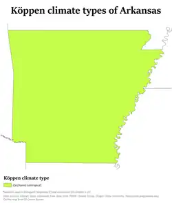 The Natural Resources Conservation Service has noted that amounts of rainfall in Arkansas are characterized by marked differences along a northeast/southwest dividing line. The northeast is characterized as arid-semiarid climate, and the southwest as a Gulf-influenced humid-subhumid climate.[31] The area that receives the most rain in the state is the area south of the Ouachita Mountains, which form an orographic effect (commonly known as rain shadow) when storms move north from the Gulf.