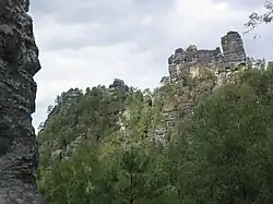 The Lokomotive (German for "locomotive") is a striking climbing rock north of Kurort Rathen in Saxon Switzerland in Germany. The rock, which resembles a steam locomotive in appearance, is also known as Große Ruine,[1] is about 30 metres high and is divided into two parts: known as Lokomotive-Dom ("Locomotive Dome") and Lokomotive-Esse ("Locomotive Chimney"). The ridge between the two is called the Kesselgrat ("Boiler Ridge"), the rock teeth next to the Esse as Pfeife ("Whistle").[2] For a short time there was a weather vane on the dome in the shape of a wheel.[3] The Lokomotive rises on the massif of the Honigsteine.