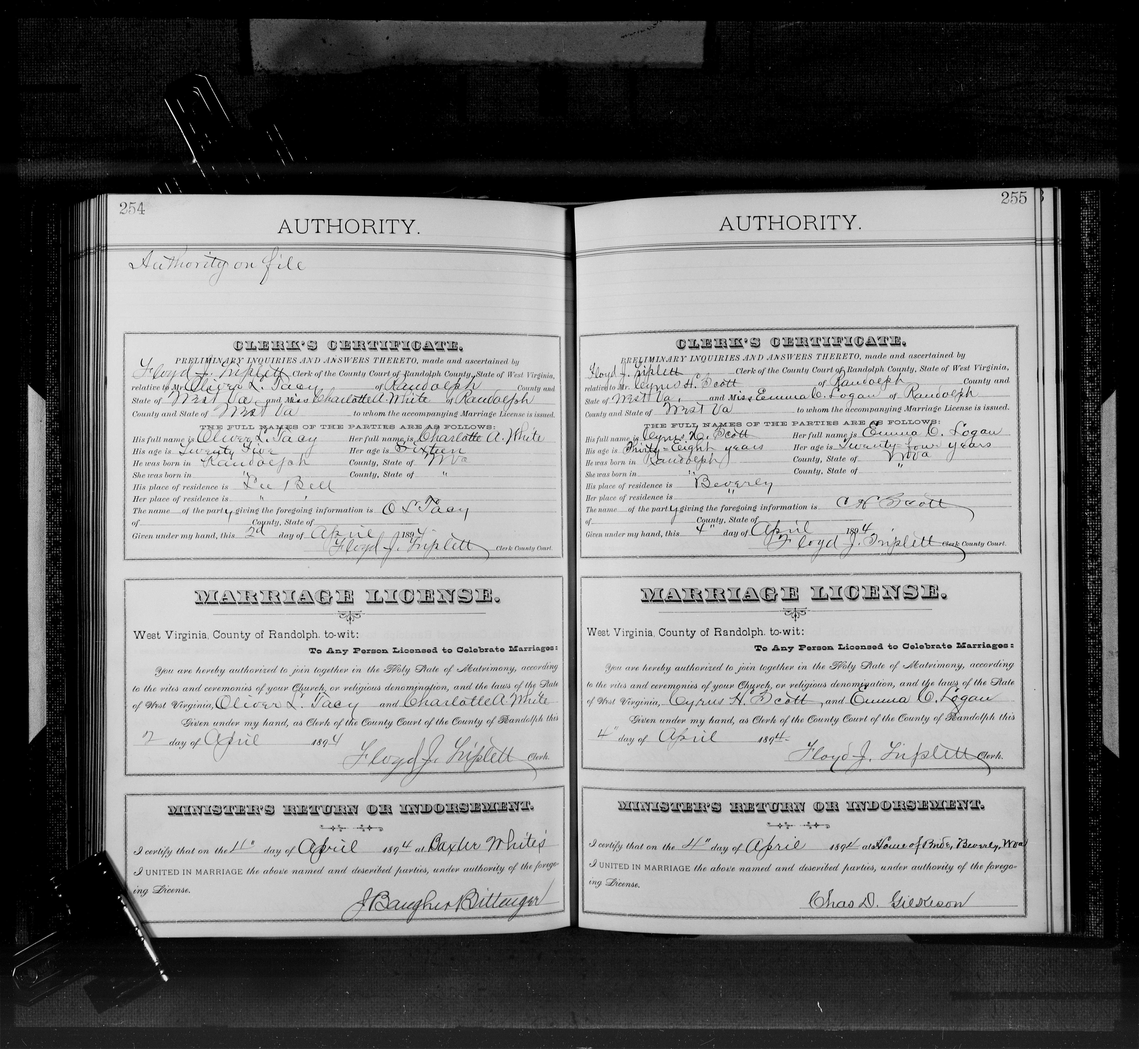 - ↑ West Virginia Vital Research Records, marriage records, https://dach-image-proxy.digital-relativity.workers.dev/?film=808787&frame=00161 and https://dach-image-proxy.digital-relativity.workers.dev/?film=808786&frame=00492