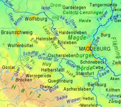 The boundaries of the Magdeburg Börde are quite ill-defined. In the west, it borders on the East Brunswick hill country stretching from the Hildesheim Börde in Lower Saxony up to the Hohes Holz forest and the town of Oschersleben on the confluence of the Bode river and the Großer Graben canal. According to the recent editions of the Handbook of the Natural Region Divisions of Germany, the western border north of Oschersleben roughly coincides with the Weser-Elbe watershed along the Druxberge hills.