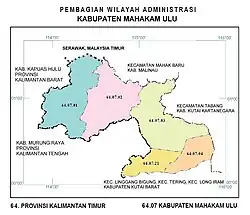 Mahakam Ulu Regency (Indonesian pronunciation: [maˈhakam ˈulu], lit. 'Upper Mahakam') is a regency (kabupaten) in the province of East Kalimantan, Indonesia. As the name implies, it comprises the upper valley of the Mahakam River. It covers an area of 18,427.81 km2. The regency was established on 14 December 2012, formed from the former northern districts of West Kutai Regency.[3] The districts now forming the regency held a combined population of 24,994 at the 2010 Census;[4] the population for the new regency at the 2020 Census was 32,513;[5] the official estimate as at mid 2024 was 39,319.[1] The administrative capital is at Ujoh Bilang, which had 5,218 inhabitants as at mid 2023.