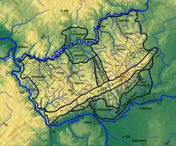 The main crest of the Taunus runs from southwest to northeast from the Middle Rhine to the Wetterau in the following natural region sections:[1]