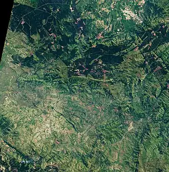 ![]() Barberton Makhonjwa Mountains on 10 March 2021; seen from space with the Operational Land Imager with Landsat 8. The Komati River runs across the centre. Eerstehoek and Elukwatini is in the lower left, with the Makhonjwa Mountains up top. | |