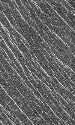 The SAR images are black and white images, which show the surface features using the intensity of radar return (echo), either due to surface roughness or orientation.[7] For SAR imaging, spacecraft do not point directly downward (nadir) but slightly to the side—anywhere from about 10° to 45°. If the surface being mapped is smooth, the incident radar pulse will be reflected away from the spacecraft, resulting in a weak echo, which is represented by darker regions SAR images. On the other hand, if the surface is rougher, then more of the radar wave will be backscattered, and the intensity of echo will be stronger, which are represented by brighter areas in SAR images.