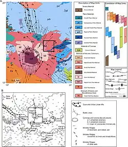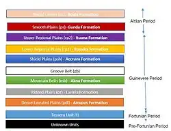 Here is a table comparing the different mapping scheme and unit identification by the Magellan science team (1994),[11] Vicki L. Hansen (2005)[12] and Mikhail A. Ivano and James W. Head (2011).[13] The possible matching of the above units are in accordance with their radar backscatter and surface features.