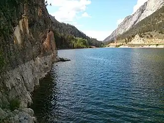 The native name of the canyon in the Shuswap language is, when referring to the whole, sxmeltám, possibly referring to "Indian doctors",[2] while the name for the area of Crown and Turquoise Lakes and the provincial campground and adjoining south wall is getsgátsp, of unknown meaning. In addition to the steep walls rising from the lake's southeastern end, there is an eroded pinnacle known as Chimney Rock, or in a translation of K'lpalekw, the Secwepemc (Shuswap) name for it, Coyote's Penis.[3]