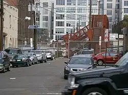 ![]() Aerial view of the warehouse district in the Marion Section of Jersey City, between the PATH train tracks and the Pulaski Skyway | |