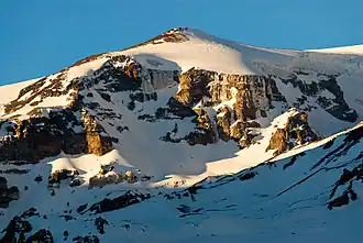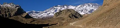Volcán Marmolejo is a 6,108 m (20,039 ft) high Pleistocene stratovolcano in the Andes on the border between Argentina and Chile.[5] It is located 9 km (6 mi) NNE of the active San José volcano, and is the southernmost 6,000 m (19,685 ft)-plus peak in the world.[6][7] The Argentine portion is within the Argentinean protection area of Provincial Reserve for Multiple Use and Natural Recreation Manzano / Portillo de Piuquenes. It is on the border of two provinces: Argentinean province of Mendoza and Chilean province of Cordillera. Its slopes are within the administrative boundaries of the two cities: Argentinean city of Tunuyán and the Chilean commune of San José de Maipo.[6][7]