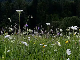 A transitional meadow occurs when a field, pasture, farmland, or other cleared land is no longer cut or grazed and starts to display luxuriant growth, extending to the flowering and self-seeding of its grass and wildflower species.[8] The condition is however only temporary, because the grasses eventually become shaded out when scrub and woody plants become well-established, being the forerunners of the return to a fully wooded state.[9] A transitional state can be artificially-maintained through a double-field system, in which cultivated soil and meadows are alternated for a period of 10 to 12 years each.[8]