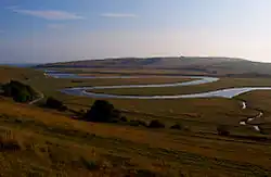 A meander is one of a series of regular sinuous curves in the channel of a river or other watercourse. It is produced as a watercourse erodes the sediments of an outer, concave bank (cut bank or river cliff) and deposits sediments on an inner, convex bank which is typically a point bar. The result of this coupled erosion and sedimentation is the formation of a sinuous course as the channel migrates back and forth across the axis of a floodplain.[1][2]