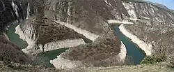 The meanders of a stream or river that has cut its bed down into the bedrock are known as either incised, intrenched, entrenched, inclosed or ingrown meanders. Some Earth scientists recognize and use a finer subdivision of incised meanders. Thornbury[32] argues that incised or inclosed meanders are synonyms that are appropriate to describe any meander incised downward into bedrock and defines enclosed or entrenched meanders as a subtype of incised meanders (inclosed meanders) characterized by a symmetrical valley sides. He argues that the symmetrical valley sides are the direct result of rapid down-cutting of a watercourse into bedrock.[1][33] In addition, as proposed by Rich,[34] Thornbury argues that incised valleys with a pronounced asymmetry of cross section, which he called ingrown meanders, are the result of the lateral migration and incision of a meander during a period of slower channel downcutting. Regardless, the formation of both entrenched meanders and ingrown meanders is thought to require that base level falls as a result of either relative change in mean sea level, isostatic or tectonic uplift, the breach of an ice or landslide dam, or regional tilting. Classic examples of incised meanders are associated with rivers in the Colorado Plateau, the Kentucky River Palisades in central Kentucky, and streams in the Ozark Plateau.[33][35]